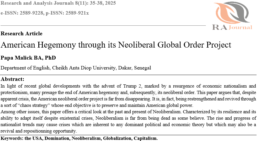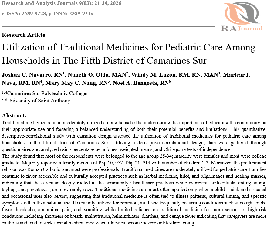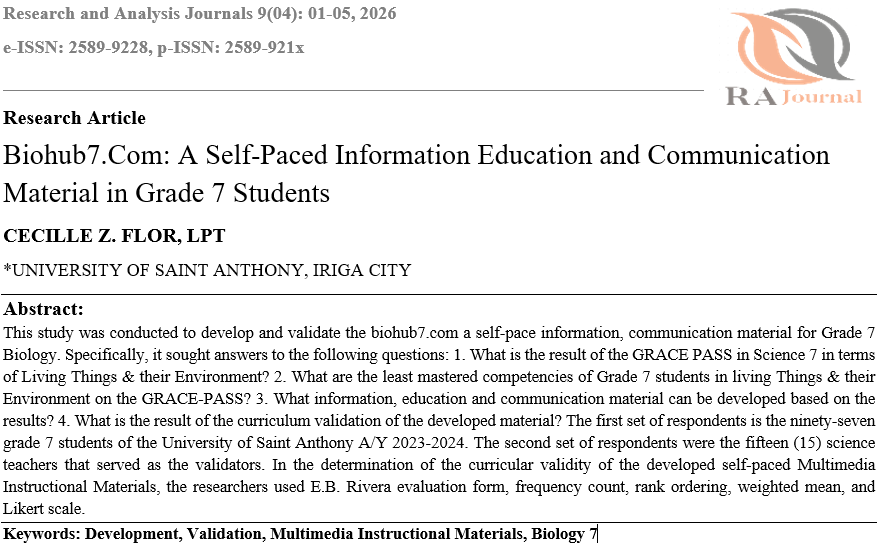 The RA Journals International Journals of Multidisciplinary Research, international peer-reviewed open access journal which publishes research articles, review articles short communications and book reviews from academicians and business-persons, our aims publish articles of high quality dealing with issues which impact national and global scientific research scholars. The RA Journals is an international peer-reviewed and multidisciplinary journal that provides a venue for scholars to publish their research findings for advocacy and utilization